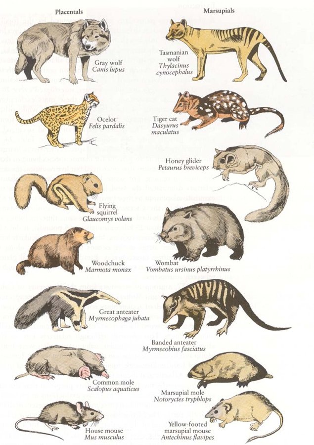 Konvergent evolution: Däggdjur vs. pungdjur. Pungdjuren på den Australiska kontinenten liknar mycket däggdjuren i övriga världen.
