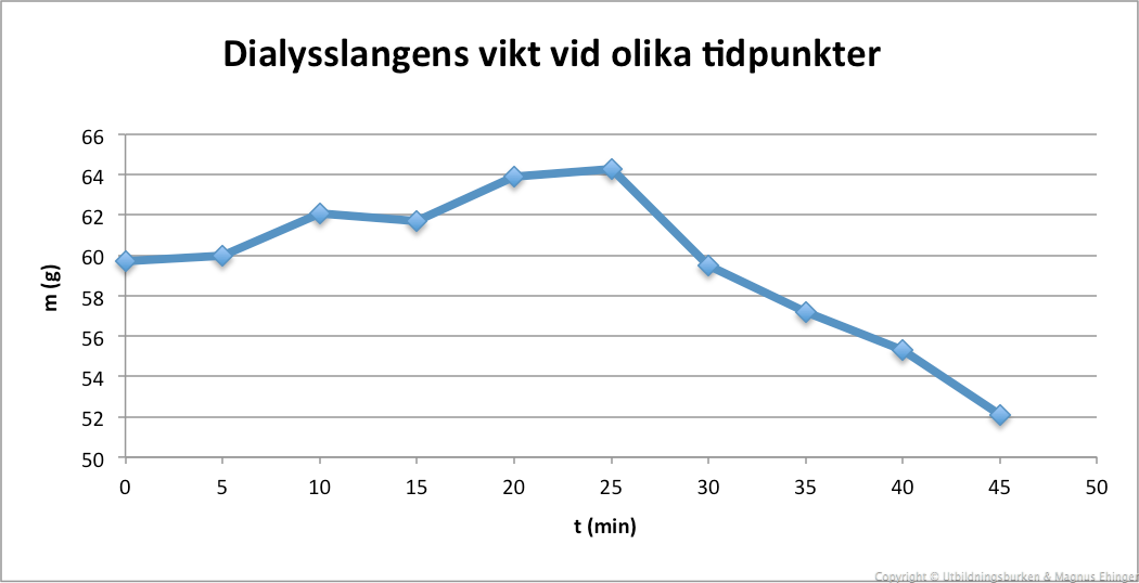 - Betrakta diagrammet nedan. Man har fyllt en dialysslang med en saltlösning av en viss koncentration, tillslutit den väl, och placerat den i en bägare med saltlösning av en annan koncentration. Därefter har man vägt dialysslangen vid olika tidpunkter, och ritat in mätvärdena i diagrammet.