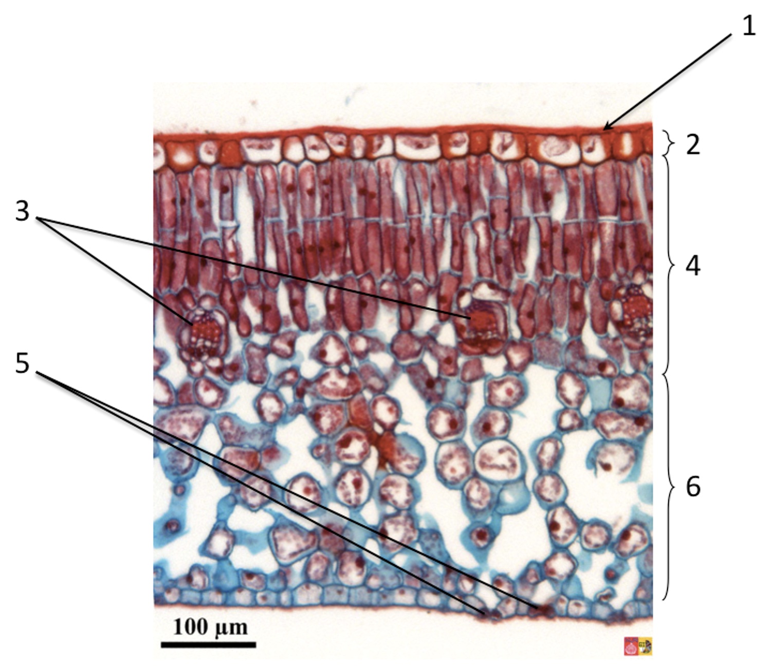 - Titta på bilden på den här länken. Den visar en mikroskopbild av ett infärgat tvärsnitt av ett blad av murgröna.