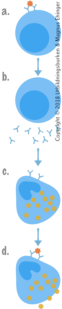 Ett allergen, t.ex. ett pollenkorn, binder till antikroppar på en B-cell (a). B-cellen aktiveras och omvandlas till en plasmacell (b). Den utsöndrar en mängd antikroppar, t.ex. IgE. IgE-antikroppar binder till mastceller i slemhinnor (c). Nästa gång allergenet binder till antikropparna på mastcellen utsöndrar mastcellen histaminer och cytokiner. Det har uppstått en allergisk reaktion.