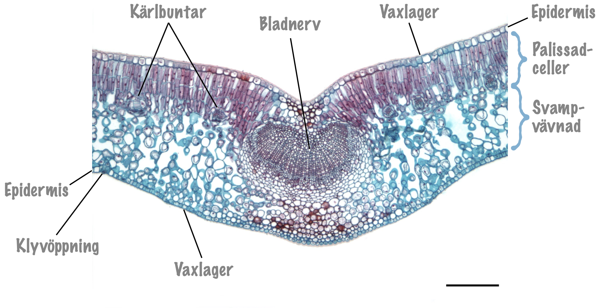 Tvärsnitt på ett blad från en tvåhjärtbladig växt.