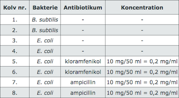 Vid biotekniskt arbete med bakterier är det för det mesta viktigt att man använder sig av kulturer som befinner sig i logfas. I denna fas frodas bakterierna som bäst och delar sig med maximal hastighet. Du ska i denna laborationen följa hur tillsats av olika antibiotika påverkar bakteriernas tillväxthastighet.