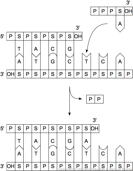 När nytt DNA bildas reagerar den inkommande nukleotiden (i detta fall dATP) med 3'-ändans OH-grupp.
