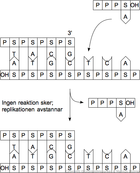 Men om en dideoxynukleotid bundit till den växande DNA-strängen (bilden ovan till höger) finns ingen 3'-hydroxylgrupp för nästa nukleotid att binda till!