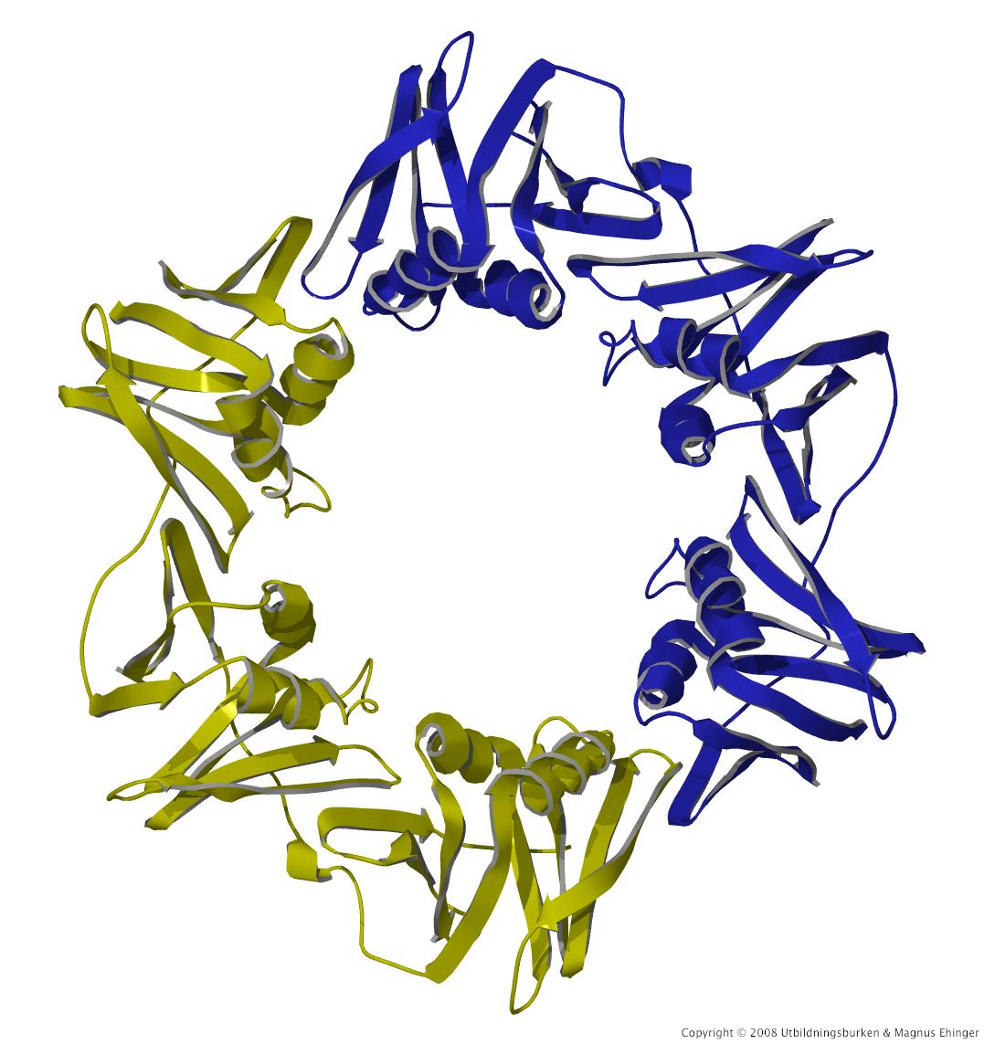 Modell av DNA-polymeras fran bakteriofag rb69. Ryggraden för den glidande klämman visas i grönt, och ryggranden för själva DNA-polymeraset i blått. Hela komplexet rör sig s.a.s. åt vänster i bilden.