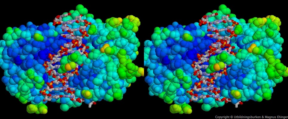 Stereoskopisk bild av BamHI, komplexbundet med DNA.