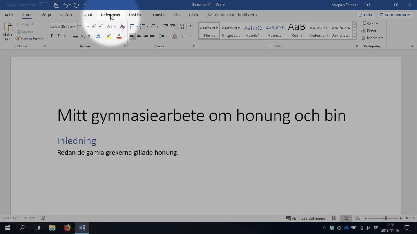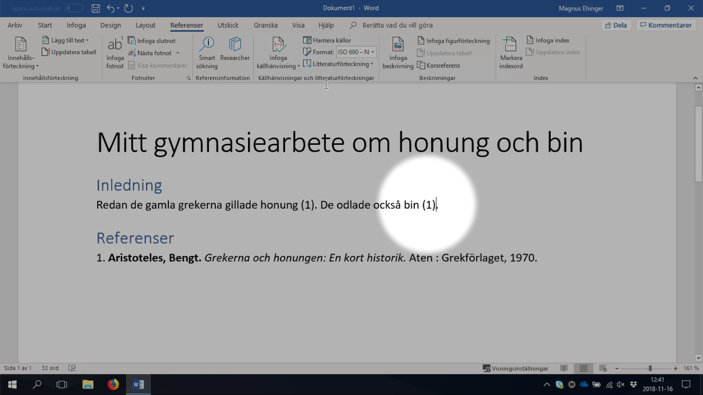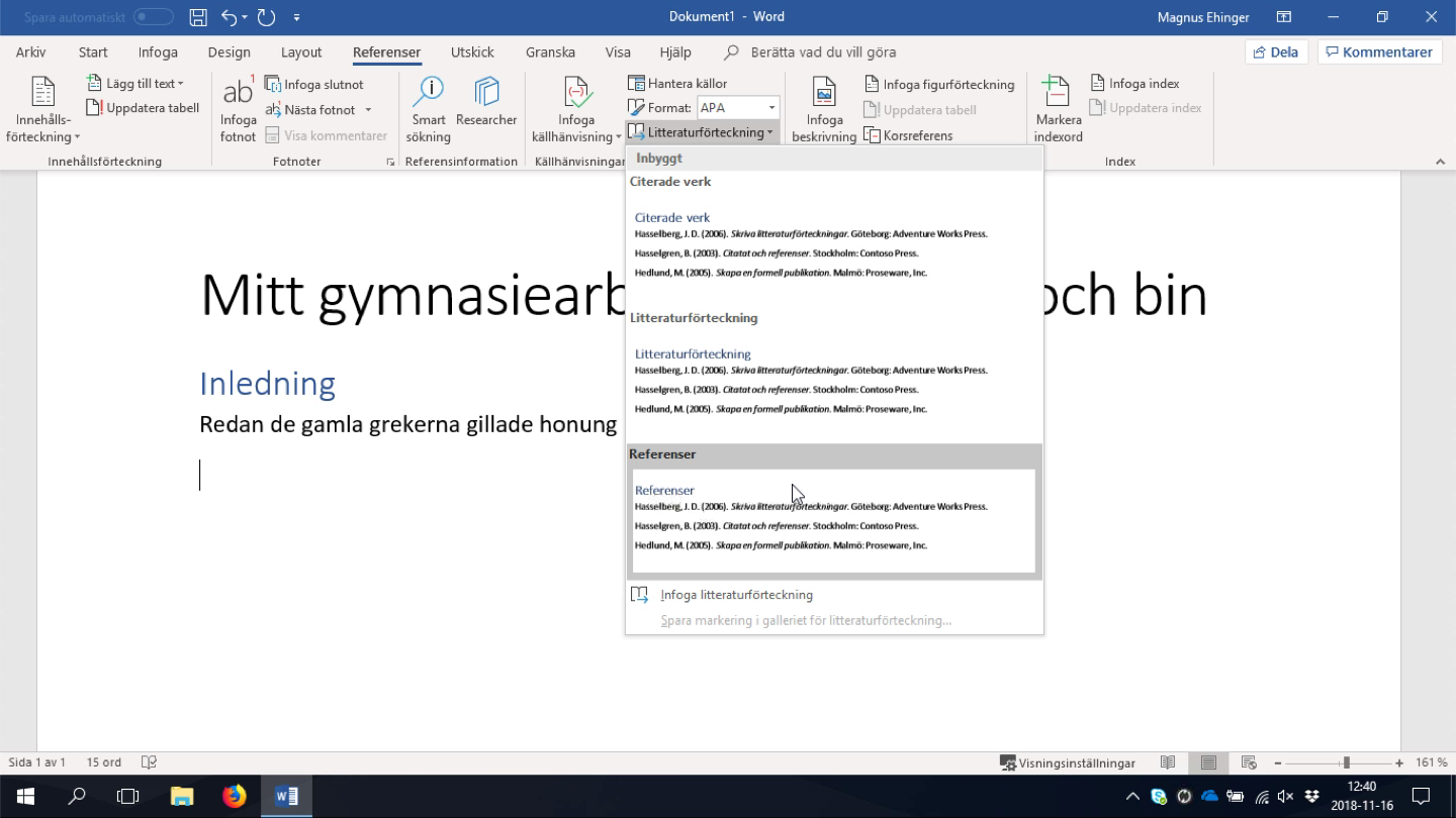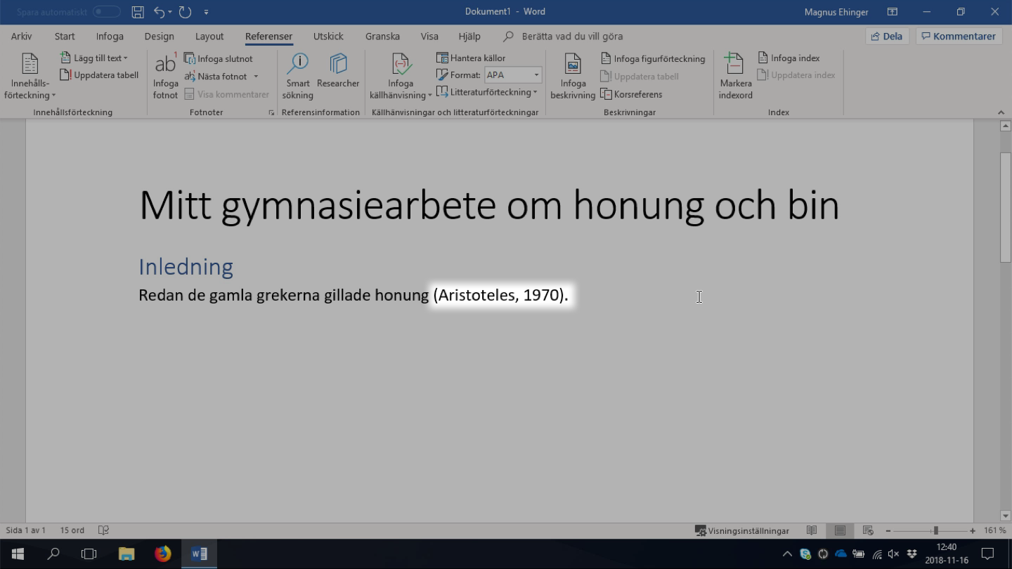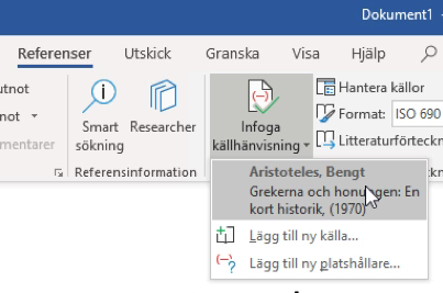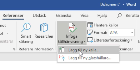 Så fort du skriver något i ditt gymnasiearbete (eller din labbrapport) som du inte har kommit på själv, så ska du belägga det påståendet med en källa. Ställ markören där du vill ha källan, och klicka på fliken "Referenser".