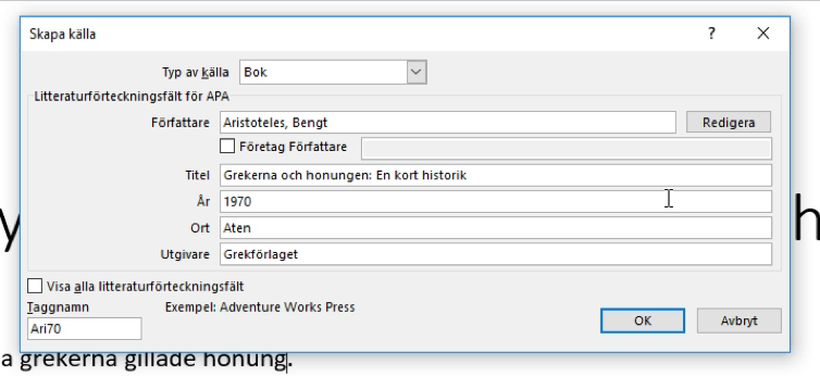 När man klickar på "OK" infogas källan direkt i dokumentet.