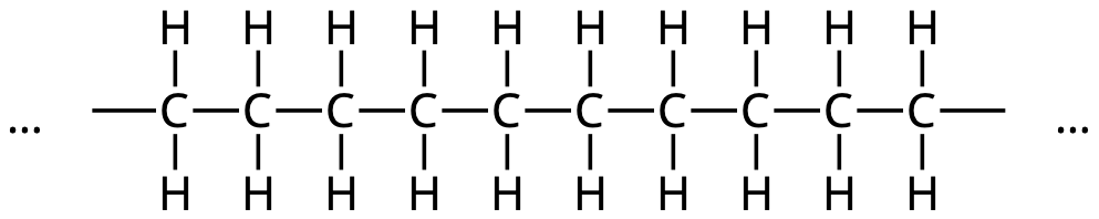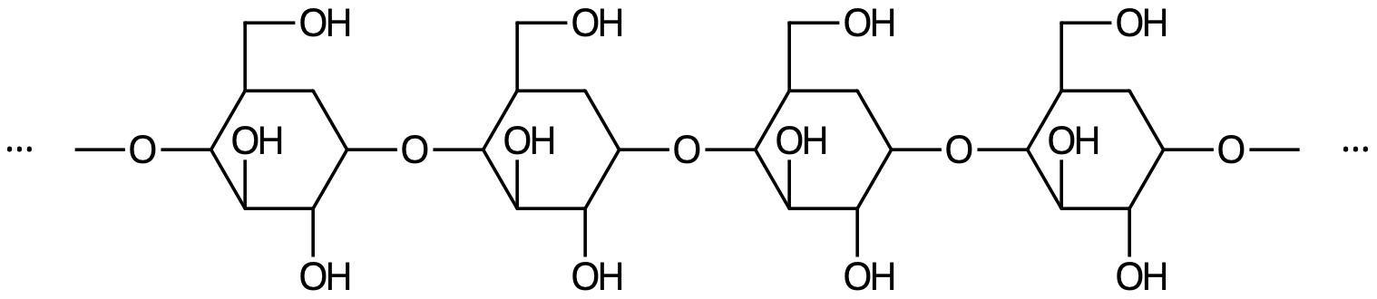 Den här frågan handlar om att jämföra bomull och polyeten. Bomull består nästan helt av cellulosa. Cellulosa är långa, långa molekyler, varav en liten del av en cellulosamolekyl visas i figuren nedan.