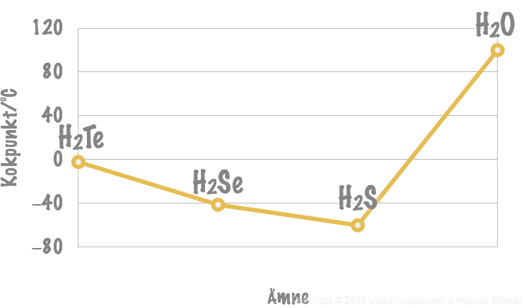 A – Eleven för också ett resonemang kring följande: Ju större atomen är, desto fler elektroner är det i atomen, och desto större betydelse (och styrka) får van der Waals-bindningen. Eftersom telluratomen har fler elektroner än selenatomen, får H2Te högre kokpunkt än H2Se. På samma sätt får H2Se högre kokpunkt än H2S, eftersom selenatomen har fler elektroner än svavelatomen.