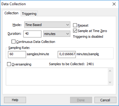 - Ställ in datainsamlingen genom att mata in ctrl-D på tangentbordet, gå in i menyn "Experiment > Data collection…" eller trycka på knappen