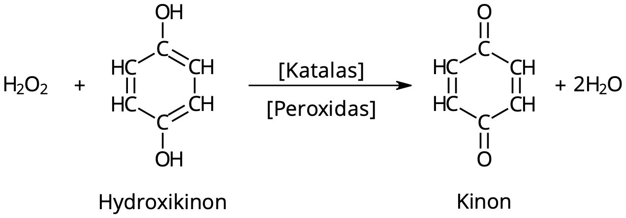 I reaktionen med väteperoxid oxideras kolatomerna med OH-grupper i hydroxikinon till karbonylgrupper. Reaktionen katalyseras av enzymerna katalas och peroxidas.