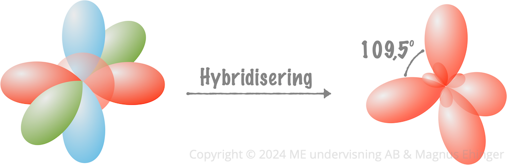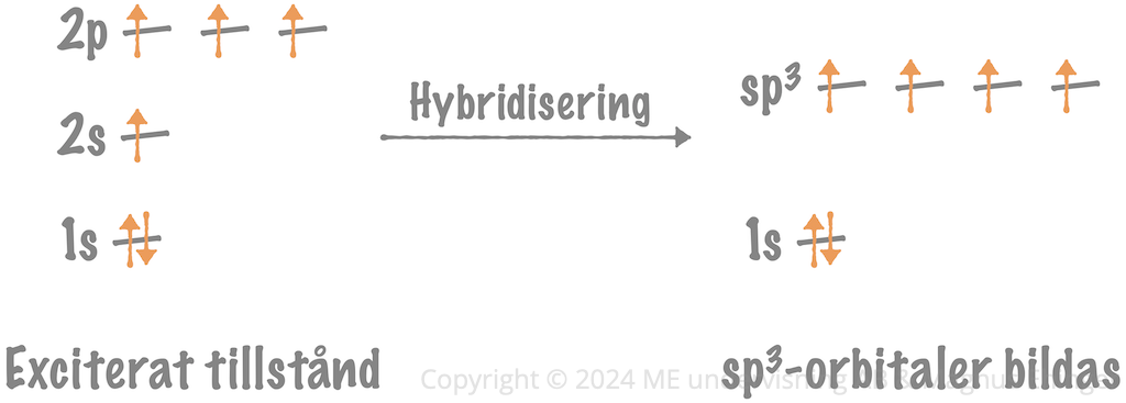 När elektronerna är fördelade på fyra olika orbitaler kan de hybridiseras till så kallade sp3-orbitaler.