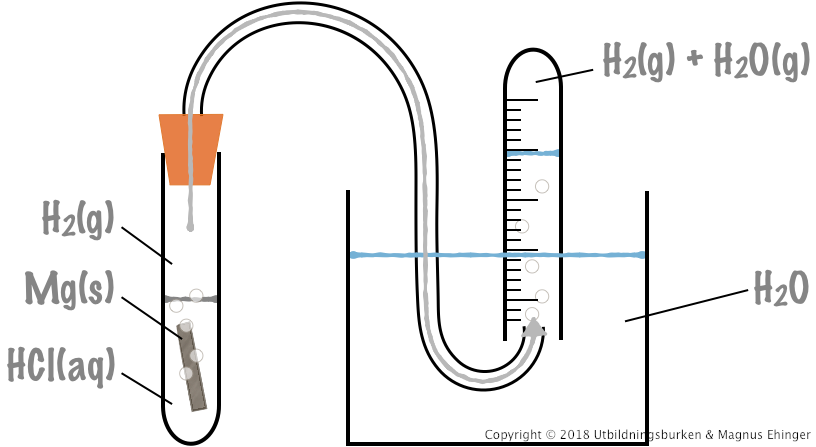 Vätgasen bubblar upp genom glasröret i det graderade provröret, och volymen total gas (H2(g) + H2O(g)) kan mätas. Med hjälp av allmänna gaslagen \(pV=nRT\), reaktionsformeln och massan på magnesiumet som reagerar kan molmassan för magnesium beräknas.