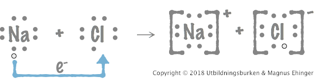 När natrium reagerar med klor avger varje natriumatom en elektron till varje kloratom.
