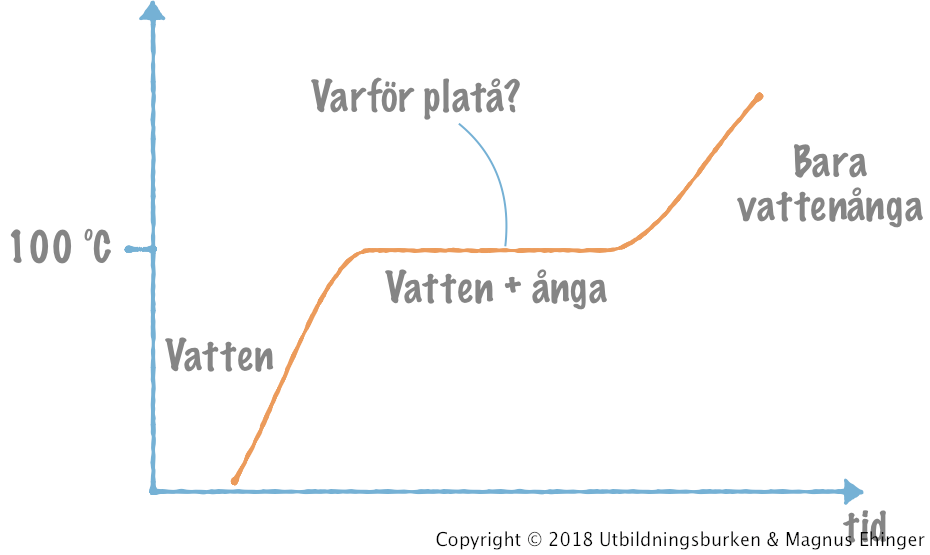 När vatten upphettas stannar det kokande vattnets temperatur på 100 °C. När allt vatten förångats kan temperaturen stiga ytterligare. Varför är det så?