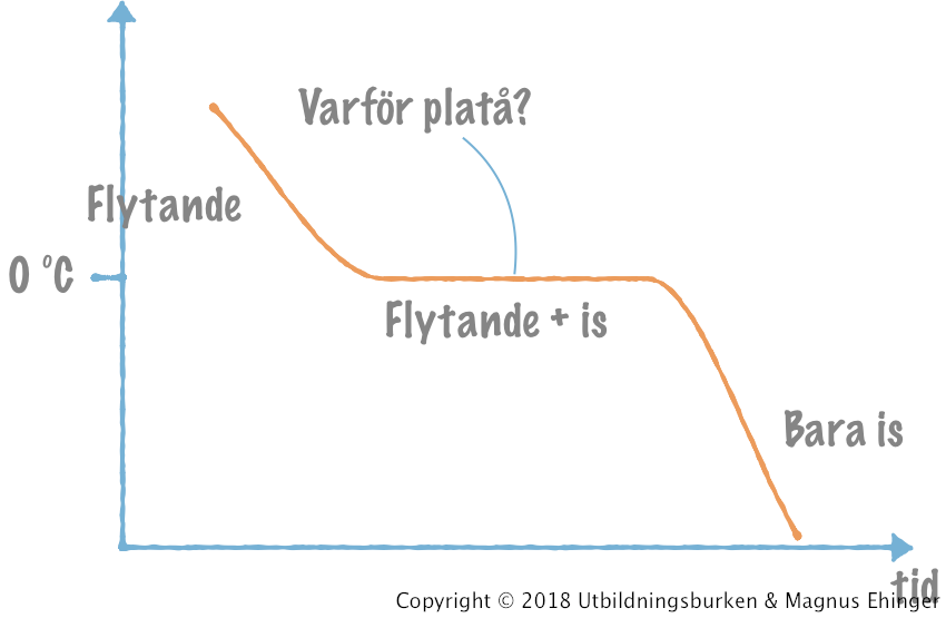 När isen håller på att bildas blir isen aldrig kallare än 0 °C. Först när allt vatten frusit kan temperaturen sjunka under 0 °C. Varför är det så?