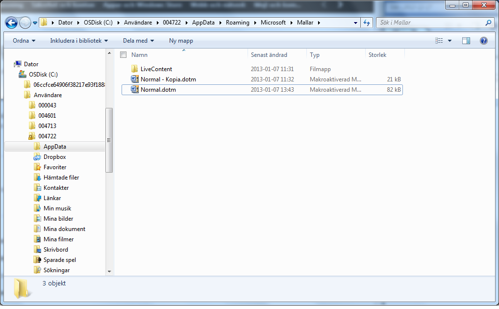 Kopiera Normal.dotm i Windows 7/Word2010.- Kopiera filen Normal.dotm till "C:\Användare\[ditt-användarnamn]\AppData\Roaming\Microsoft\Mallar" (se bilden nedan).