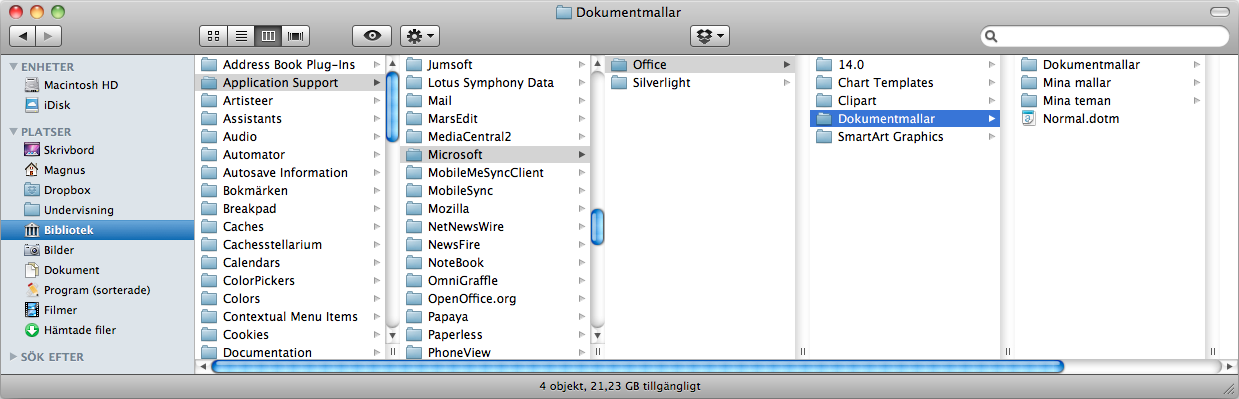 - Kopiera filen Normal.dotm till "Bibliotek > Application Support > Microsoft > Office > Dokumentmallar" (se bilden nedan)