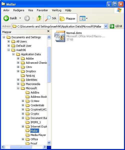 - Kopiera filen Normal.dotm till "C:\Documents and Settings\[ditt-användarnamn] \Application Data\Microsoft\Mallar" (se bilden till höger).