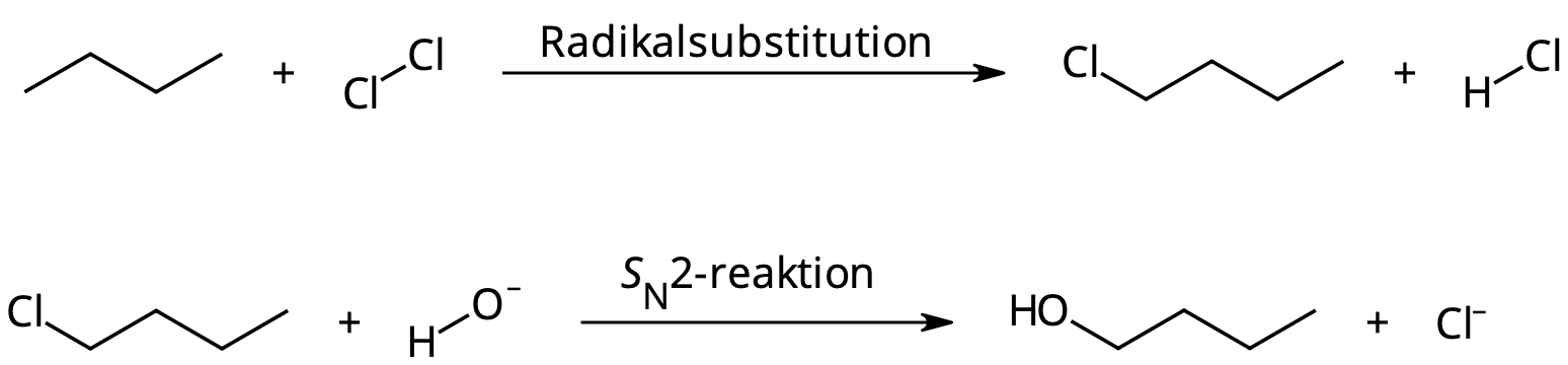 - I ett experiment vill du tillverka 1-butanol genom att utgå ifrån butan och göra två substitutionsreaktioner på den. Vilka två substitutionsreaktioner ska du utföra, och i vilken ordning?