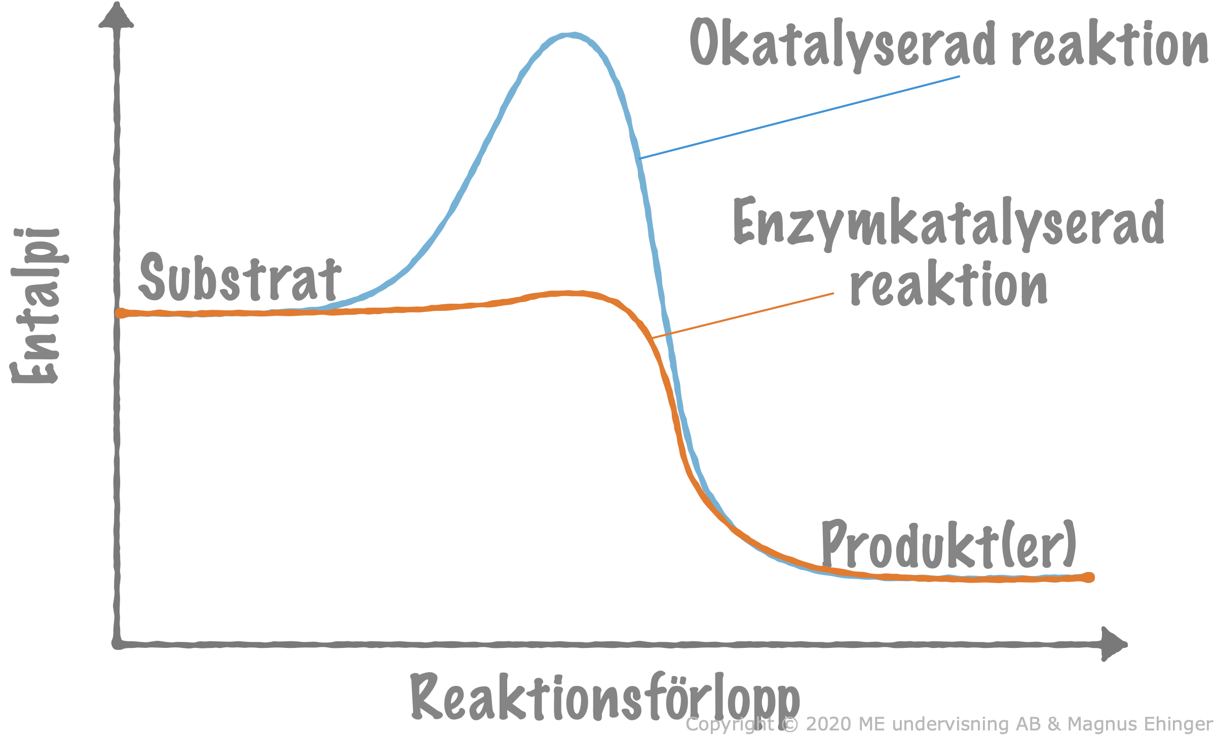 - Det beror på att enzymet sänker reaktionens aktiveringsenergi, d.v.s. den energi som krävs för att reaktionen ska kunna ske.