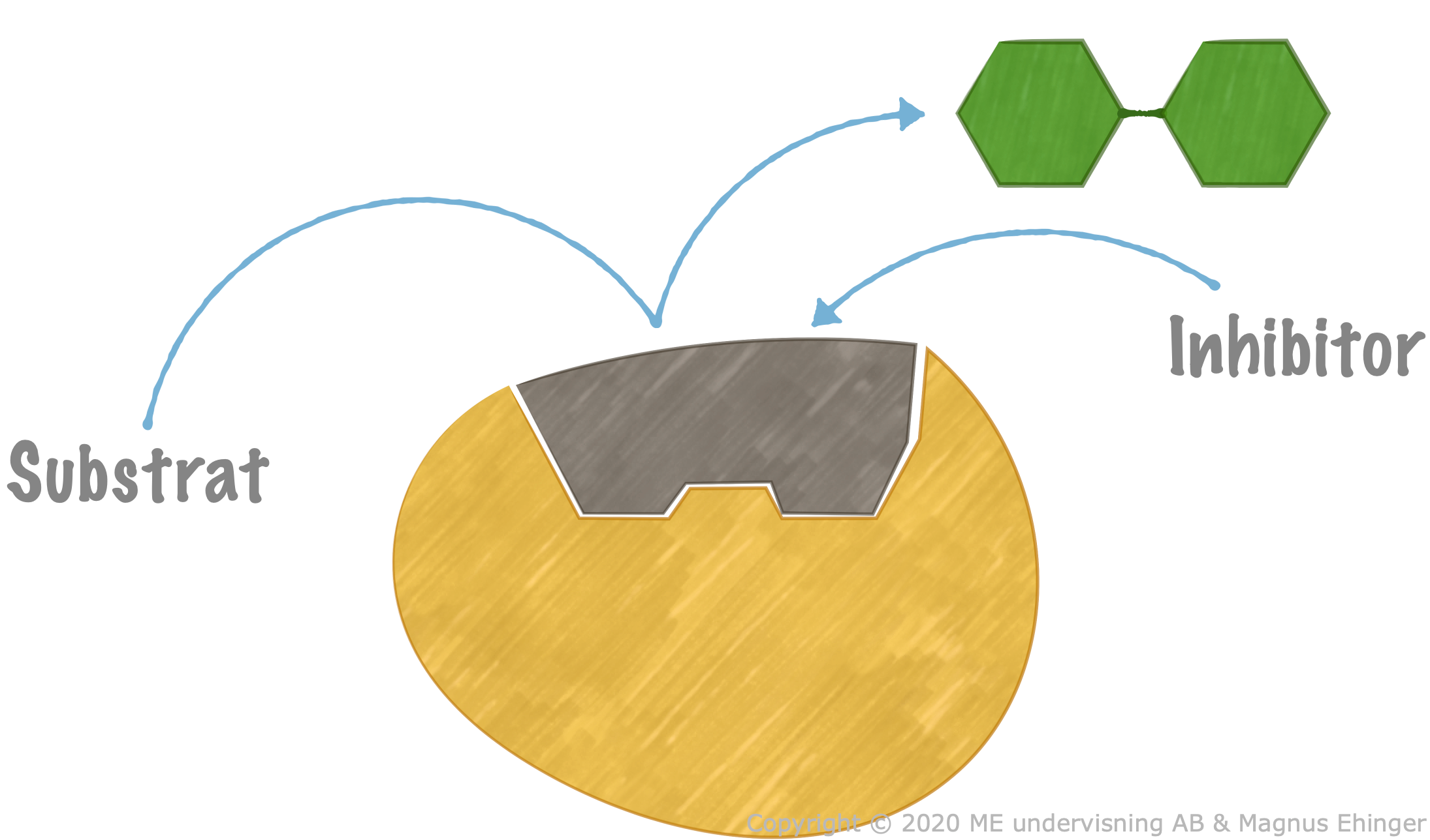 - inhibitorn förhindrar att enzymet ändrar form, även om substratet kan binda in ⇒ ingen reaktion sker.