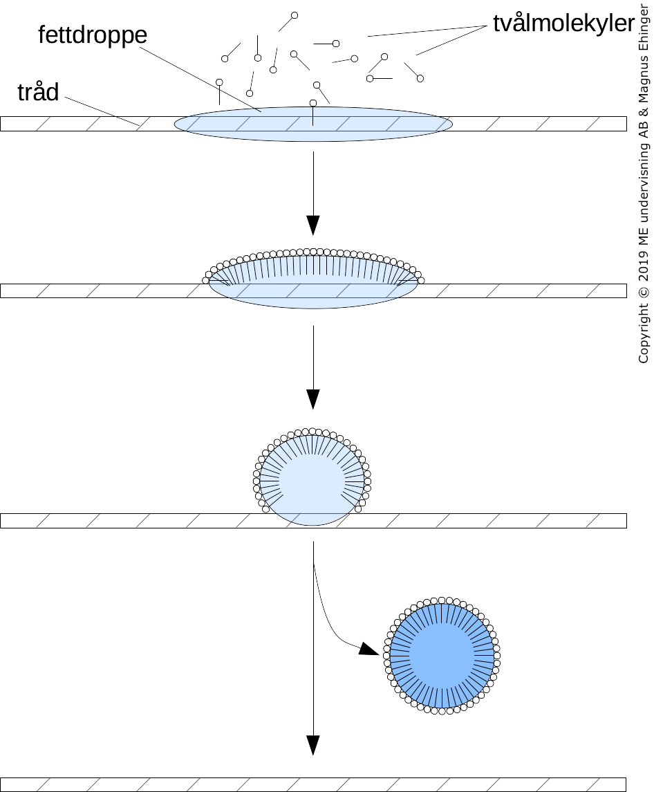 Genom att tvålmolekyler löser sig i fettdroppen (smutsen) görs fettet lösligt i vatten, och kan sköljas bort med tvättvattnet.