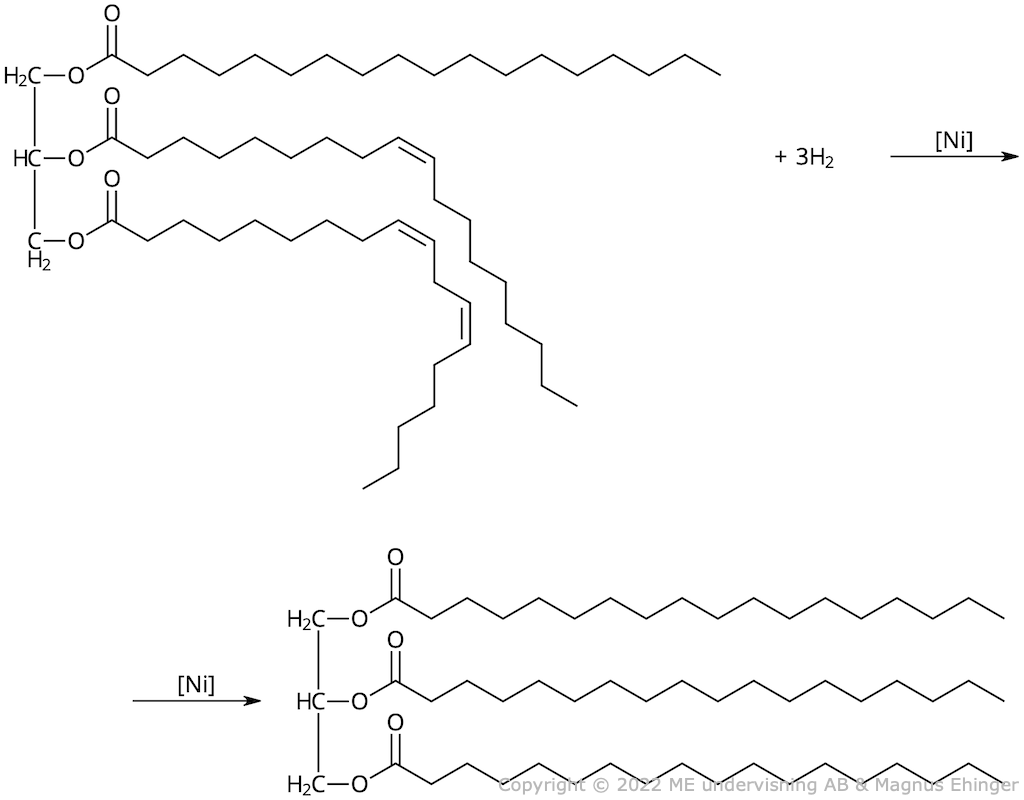 - Fettet härdas genom att H2 adderas över dubbel-bindningarna (med Ni som katalysator).