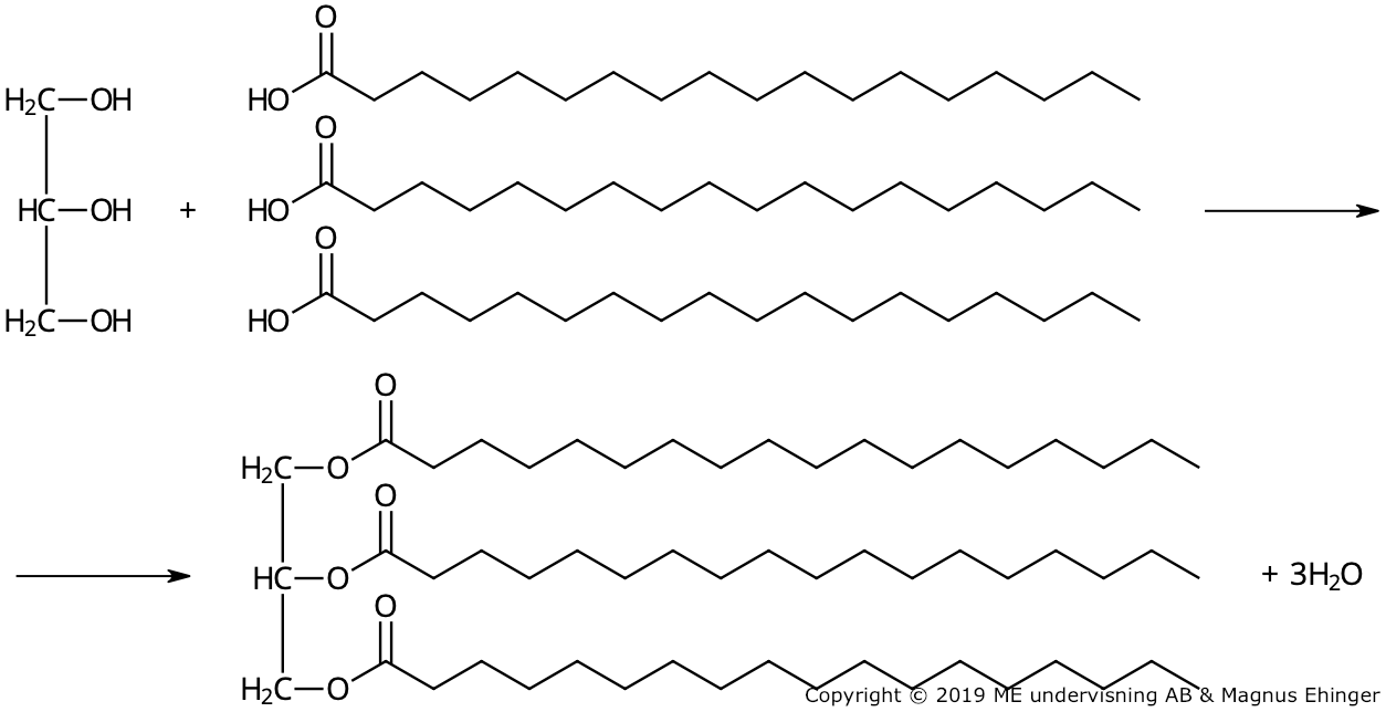 När en glycerolmolekyl reagerar med tre karboxylsyror, bildas en glyceryltriester.