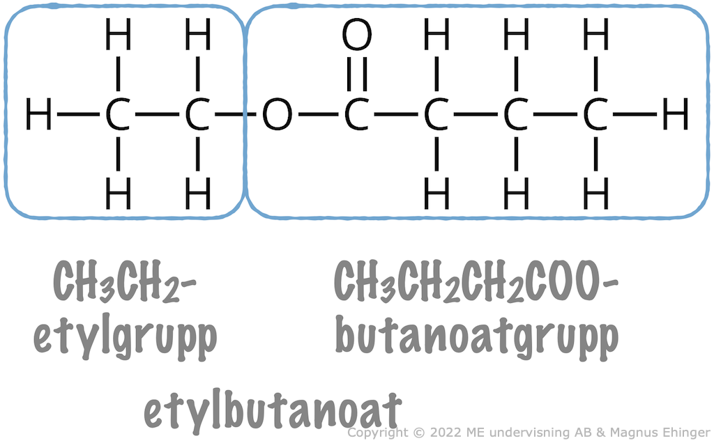 Till vänster i estern ovan är det en etylgrupp (från etanolen som reagerade). Till höger är det en butanoatgrupp (från butansyran som reagerade). Därför är esterns namn "etylbutanoat".