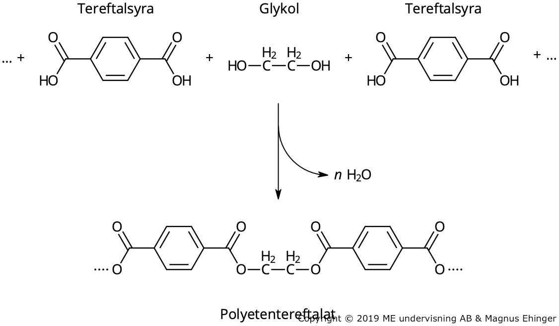 Uppbyggd av tereftalsyra (bensen-1,4-dikarboxylsyra, en dikarboxylsyra) och glykol (etandiol, en tvåvärd alkohol):