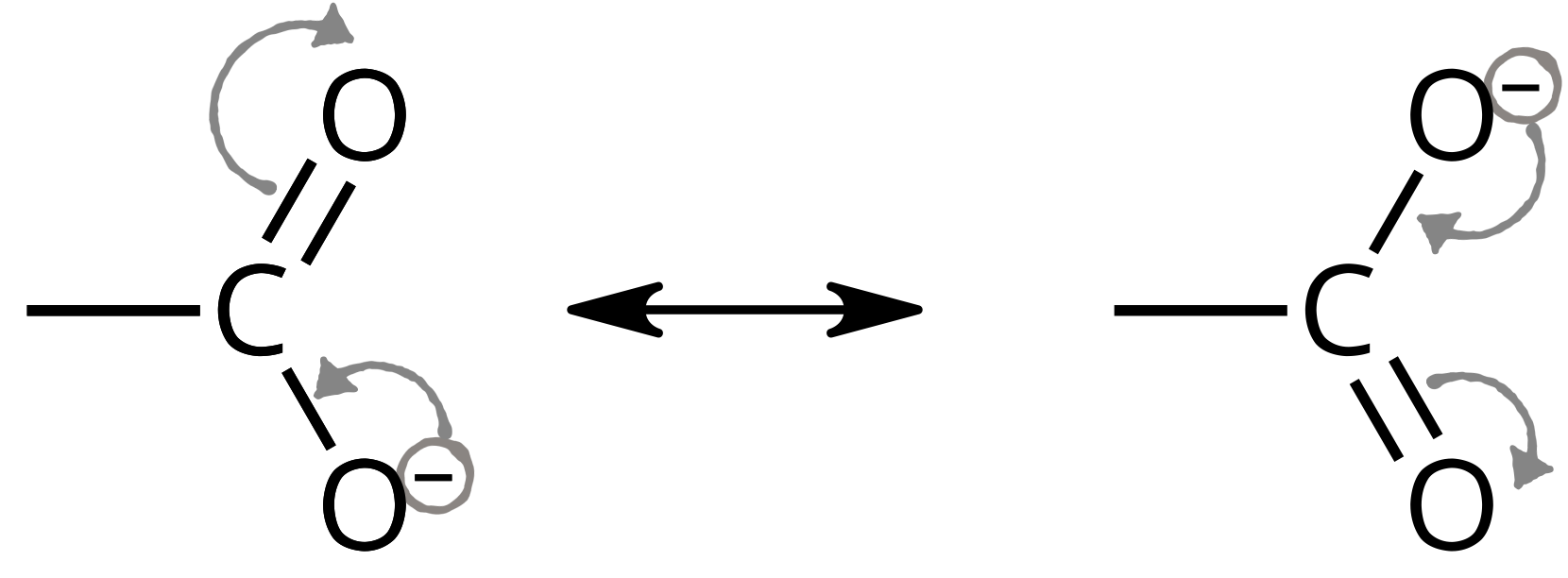 - Karboxylatgruppen existerar i två olika resonansformer, där minusladdningen ibland är på den ena syreatomen, ibland på den andra: