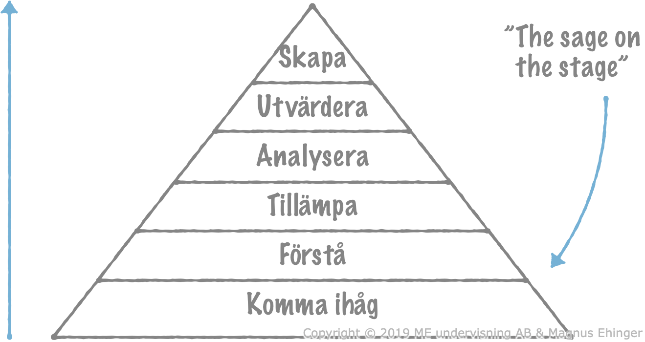 I traditionell "föreläsningsundervisning" är läraren vad som ibland kallas för the sage on the stage. Det innebär till att läraren tillbringar den mesta tiden med sina elever i de lägre nivåerna av Blooms reviderade taxonomi (figur 2). Då är risken också stor att läraren missar att vara med eleven i nästa steg av förståelsen, där eleven får kämpa mer för att ta sig vidare.