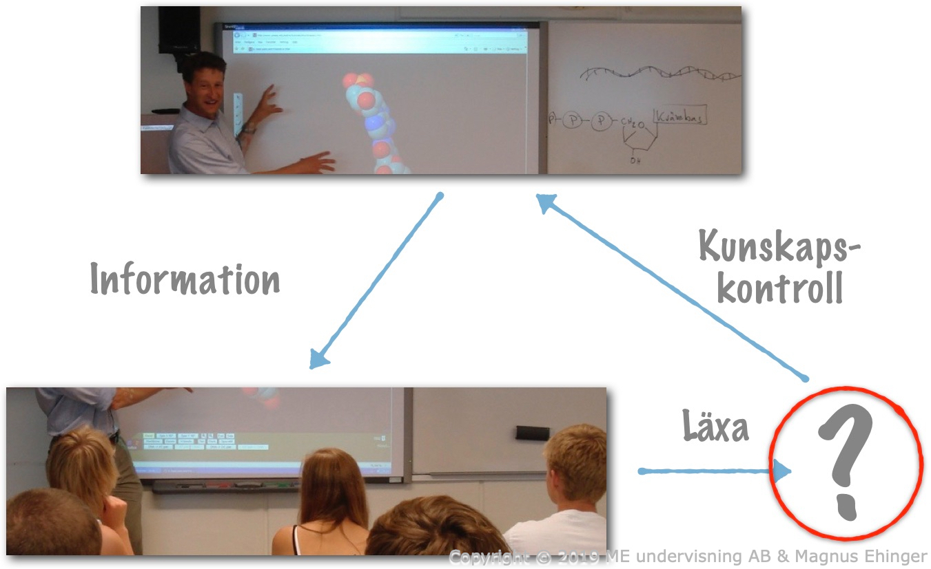 Figur 1. I traditionell katederundervisning sker informationsöverföringen i klassrummet. Det verkliga lärandet, när eleven arbetar med materialet i läxan, sker någon annanstans – utan stöd av läraren.