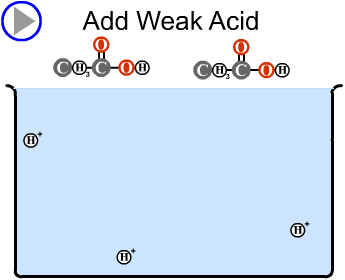 En buffert består av en svag syra + dess korresponderande bas. I exemplet nedan är det ättiksyra + natriumacetat. Lägg märke till att det är 4H+ i lösningen. När man tillsätter en stark syra, tas protonen upp, så att det fortfarande bara är 4H+ i lösningen! Vid tillsats av måttliga mängder syra/bas ändras alltså inte pH i en buffertlösning. Från www.stolaf.edu.