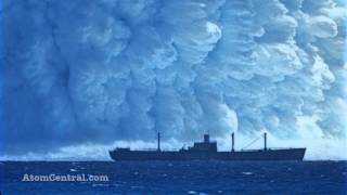 Paul Bradley, som filmade två undervattenstest av atombomber 1958 – med kodnamnen Wahoo och Umbrella – berättar vad som hände när bomben small av. Inte så lite skrämmande, tycker jag, med den där enorma väggen av vatten som reser sig ur havet – och hur sedan väggen slår totalt över båten som ligger för ankar strax intill.