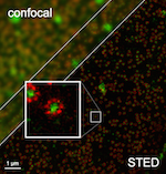 Jämförelse av upplösningen vid s.k. konfokalmikroskopi (överst) och STED-mikroskopi, som utvecklades av en av nobelpristagarna.Nobelpriset i Kemi går i år till Eric Betzig, USA, Stefan W. Hell, Tyskland, och William E. Moerner, USA, för "utveckling av superupplöst fluorescensmikroskopi".